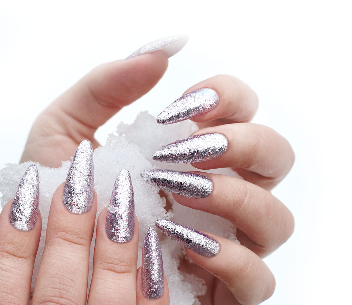 Так как блестки придают определенную прочность ногтям, под ним не стоит делать укрепляющее покрытие слишком толстым.